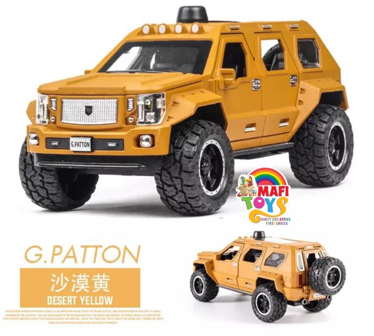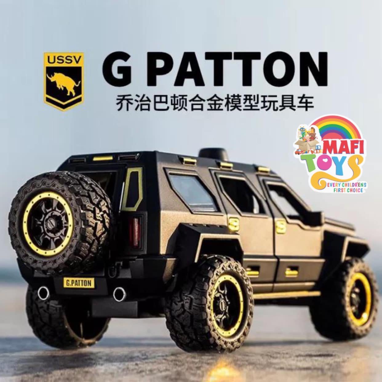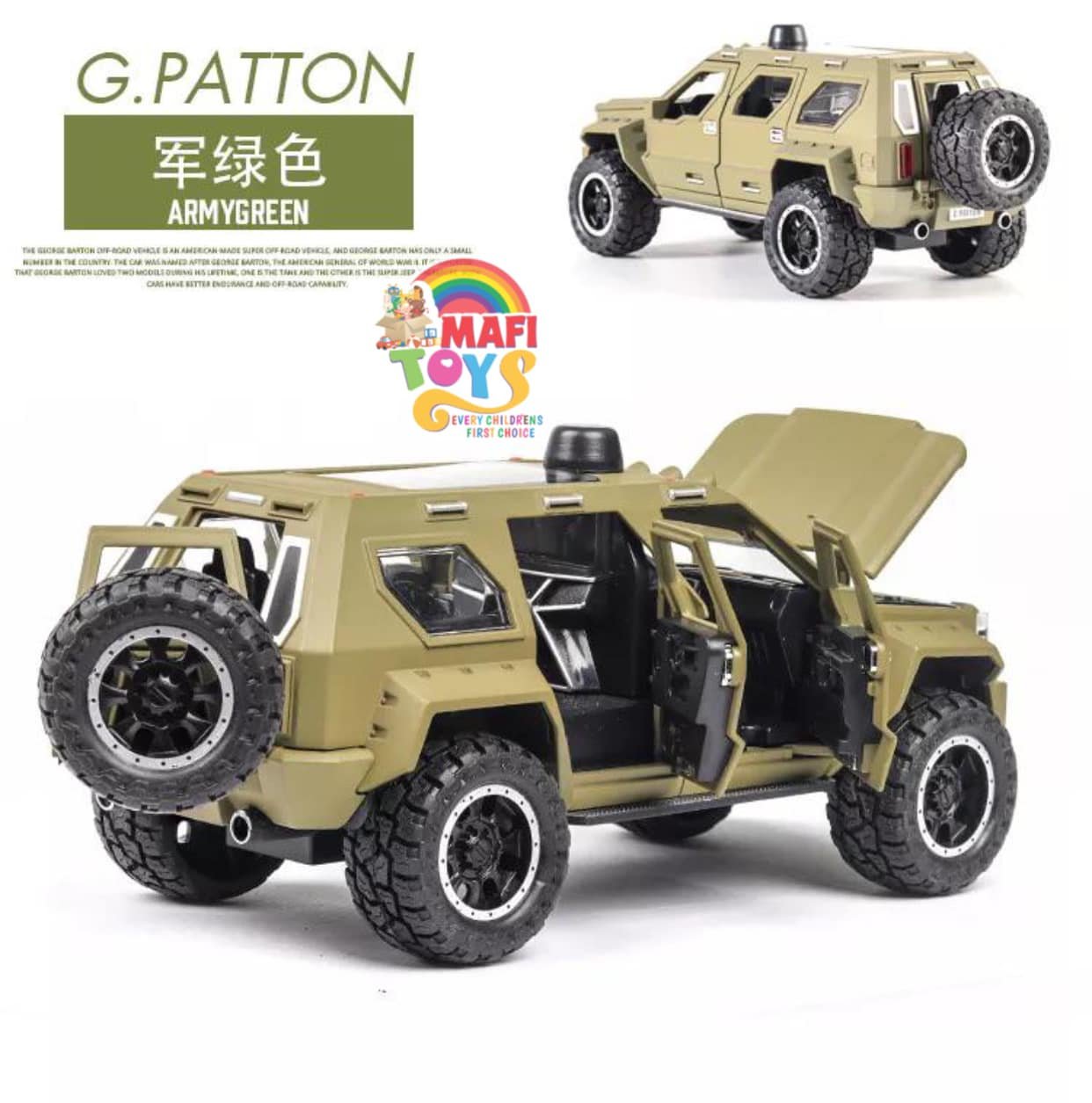 Be the first to review “1:24 George Patton Chariot Model Simulation Alloy Jeep Hummer Children’s Military car Toy Off-Road Vehicle Big Daddy Pull Back SUV with Blinking Lights”