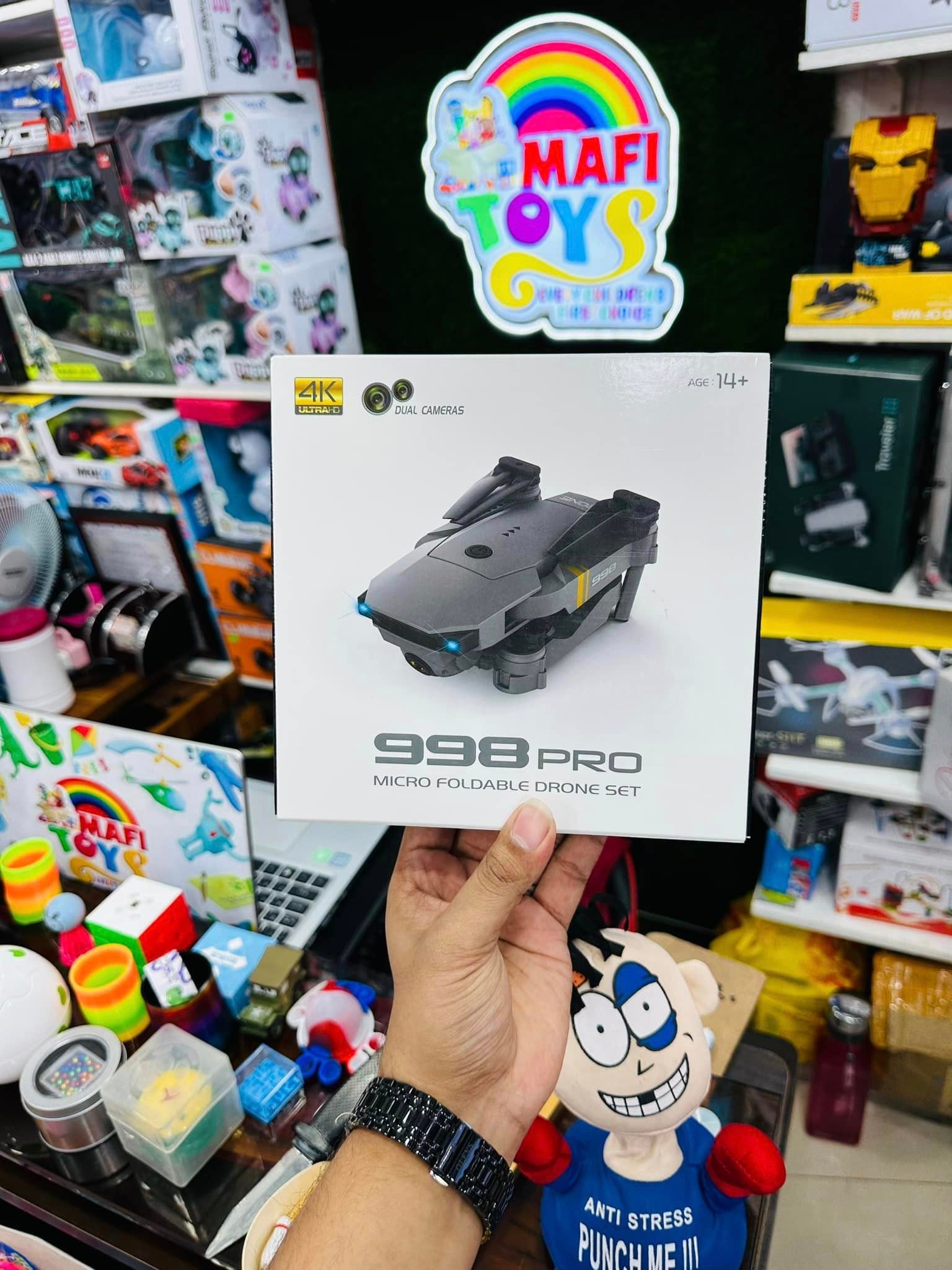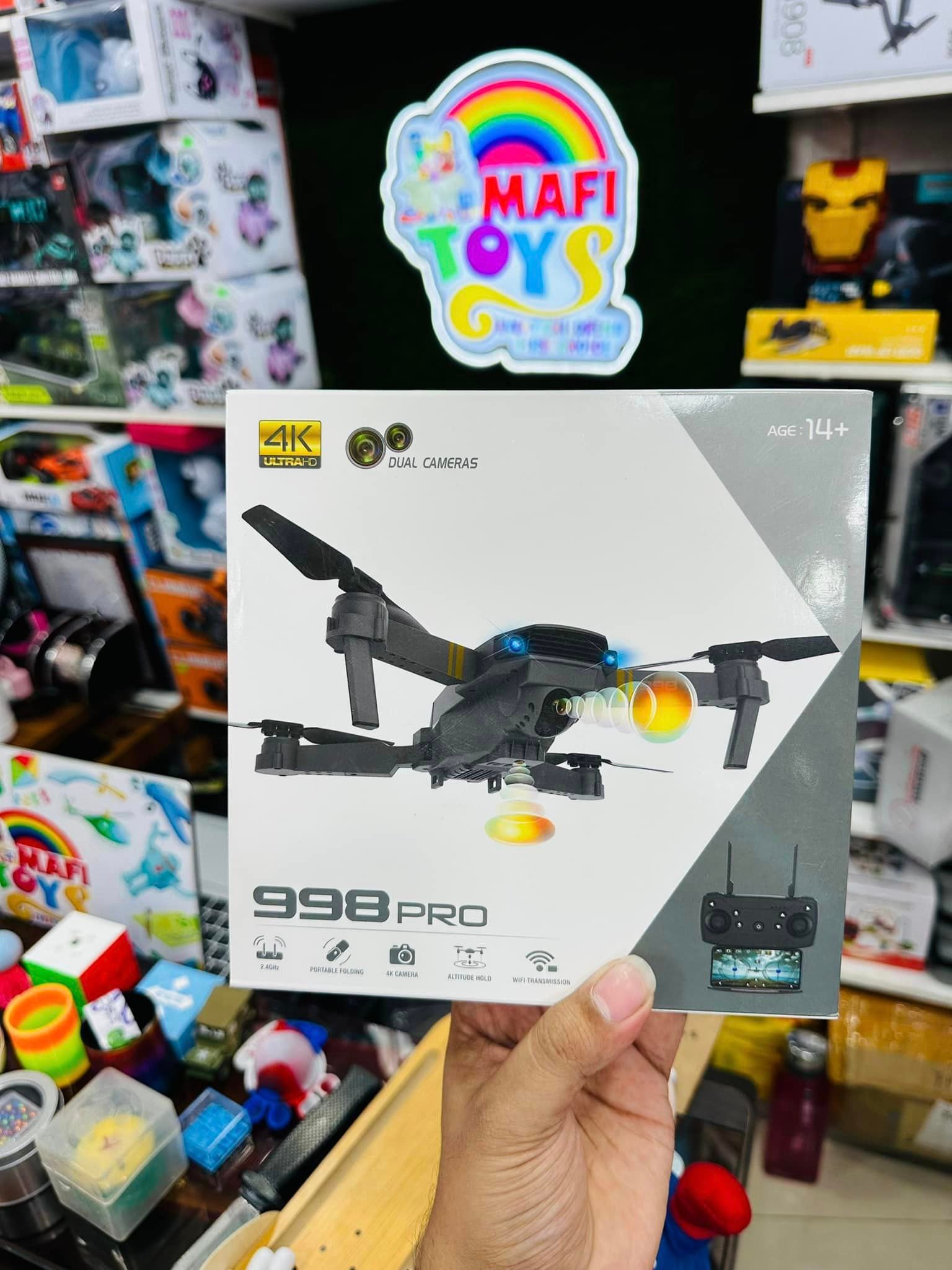 It has built-in two cameras. The 998 Pro drone will be accompanied by a remote to control the drone. It also can be controlled through apps with any smart mobile on Android and iPhone.